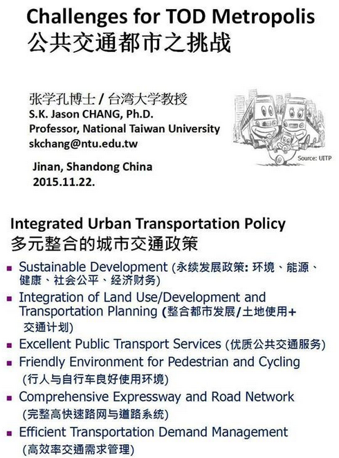 臺灣大學(xué)土木研究所教授張學(xué)孔先生正在圍繞“公共交通都市之挑戰(zhàn)”主題進行演講。張學(xué)孔教授首先對公共交通都市發(fā)展現(xiàn)狀進行描述,今天的演講要點有“各大城市交通政策,公共交通都市成功要素與挑戰(zhàn),如何把挑戰(zhàn)和危機轉(zhuǎn)變成機會,成就優(yōu)質(zhì)公用交通服務(wù)?!辈c大家分享城市規(guī)劃、設(shè)計,公共交通使用、管理之間的關(guān)系。